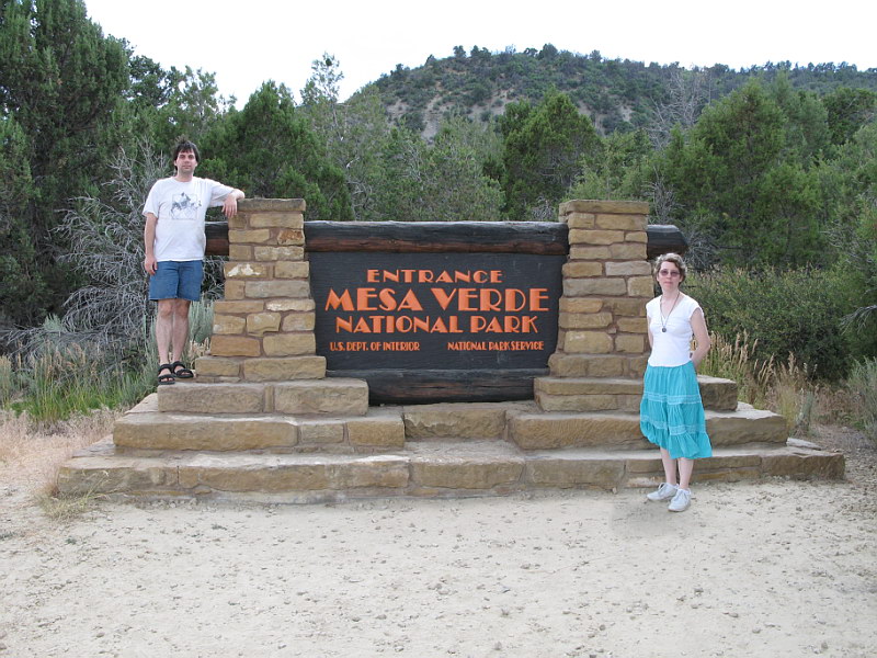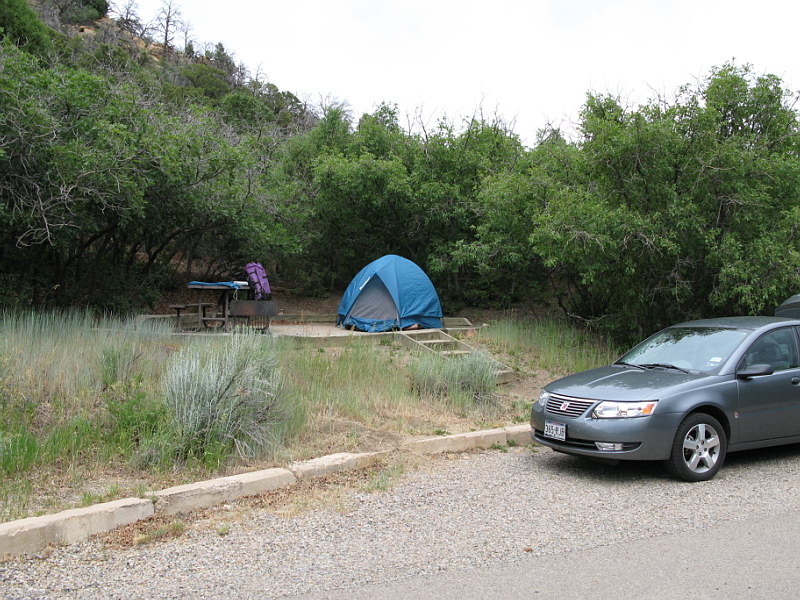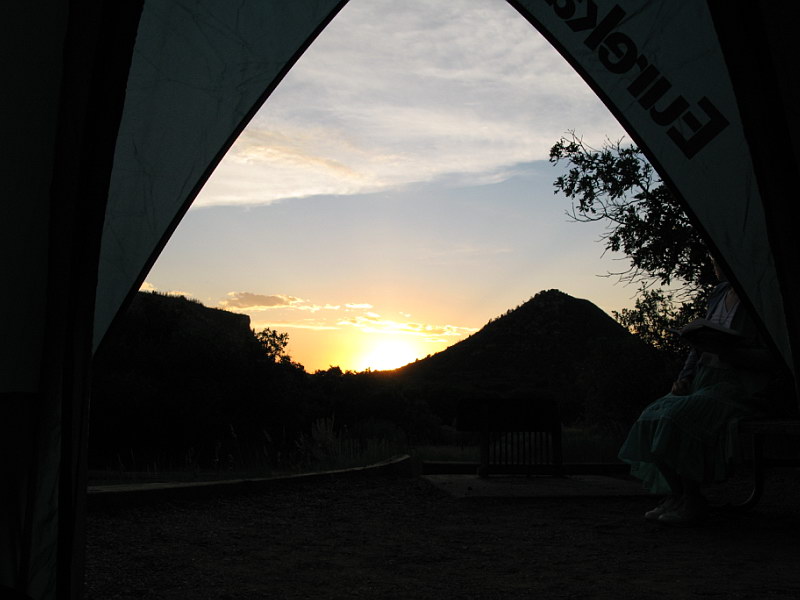 We started our Independence Day by buying some ice to help keep our perishables cold (baby carrots, bread, trail mix with chocolate as well as the water jugs) and then made our way to Mesa Verde – which is in the southern part of Colorado. After driving nearly the whole length of New Mexico the day before, I had somehow thought the trek to Colorado would be a cake-walk. As it were, it was still a long haul of several hours; but we did drive through some amazing country! The scenery was always changing from stunning painted hills, to white-faced cliffs; from barren scrub to pine-covered hills that were reminiscent of back home. Soon after entering Colorado, we stopped off at a visitor center to get the lay of the land and to get more local info on Mesa Verde. The ladies were very helpful and informative, providing us with maps and directions on how to get to the camp ground in the park. After the visitor center it was just a sort drive to the entrance of Mesa Verde. We paid our admission fee, then our camping fee and then paid for a couple tours for the next day. There were many people at the camp-sites but they were all friendly and it wasn’t too noisy. This was our first opportunity to tent-camp on the trip and it was a good evening for it. After pitching the tent and eating a light dinner, we spent the remainder of the evening walking around the camp-grounds and unwinding from our long day. That night a thunderstorm rolled in and though we heard rain falling around us and some heavy winds buffeted the area at various points, we had chosen a sheltered enough place that we didn’t really get rained on and the wind never affected the tent all that much. |