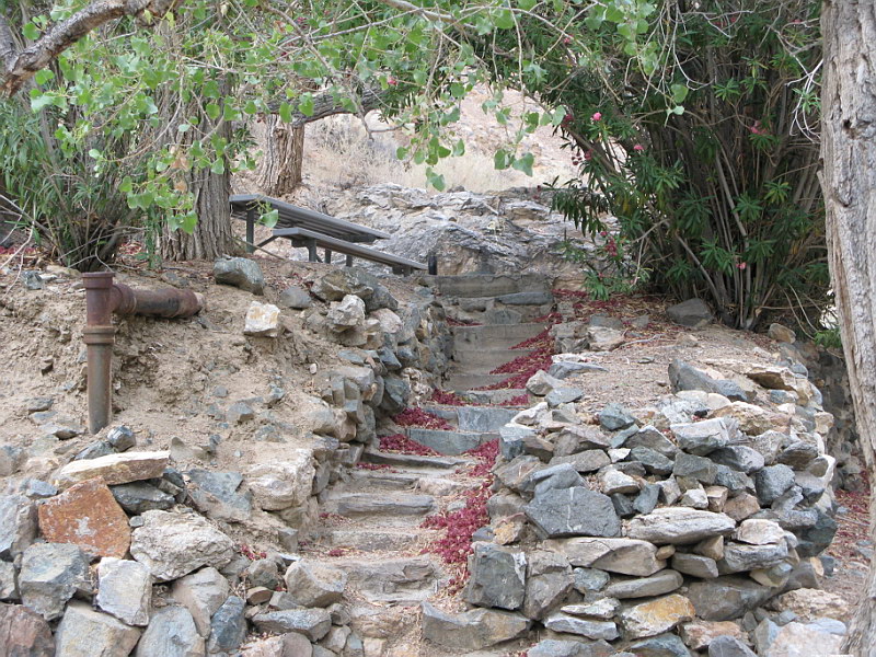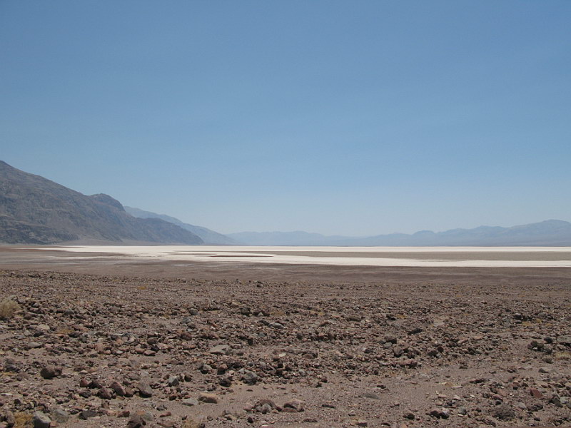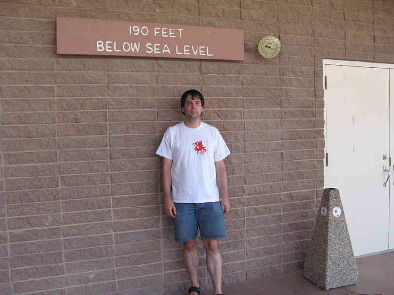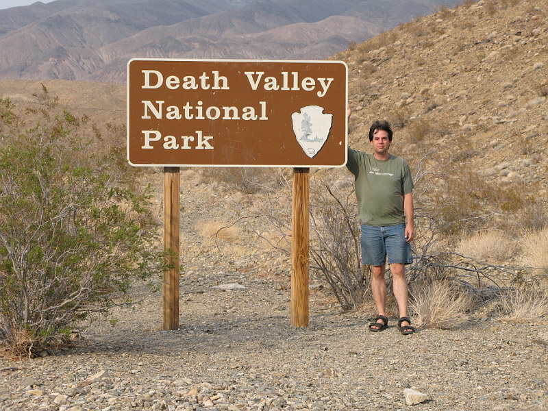 In the morning we packed and made our way back over the roads that aren’t meant for a Saturn Ion, up to the main Ranger Station. We paid our admission fee and chatted with the Rangers some. We found out that entry receipts to National Parks could be used towards the $80.00 annual Parks Pass that gives you free admission to all Nation Parks and Monuments for a whole year. We did some quick math and discovered we’d already come pretty close to spending that much and we still had a couple more parks to hit – that was exciting news indeed! :) I’ll make a quick comment here that Death Valley in July really is no walk in the park. By 9:00 the temperature in the shade was 110 degrees and when we filled our water jugs at one of the ubiquitous spouts, the water was hot enough to nearly scorch you! Still, we were having fun and were eager to get down to Badwater – the lowest spot in the USA: an impressive 282 feet BELOW sea level. Badwater is situated in the middle of a barren salt flat that ironically, really does have small pools of water; it’s just very saline (hence the name). After snagging some quick pics, we hightailed it back to the car and out of Death Valley. There were a couple tense moments as the car made the climb out of the valley – we were watching, with growing worry, the temperature gage slowly creep up towards the red zone. Right when I was about to suggest to Rick that maybe we should pull over and let the engine cool, we crested the hill and the temp went back to normal in a matter of minutes. “I see why they call it Death Valley!” was a frequent joke among us. With desolate Death Valley behind us we were pleasantly shocked to find the beauty and splendor of the Sierra Nevadas in front of us. Never before had I seen such incredibly stunning mountains – stark, sere granite spires rising up and up to the deep blue sky. Truly a site to behold! With these amazing mountains as a backdrop, we stopped off at a set of hot springs we’d read about from a book on hot pools and springs of the Southwest that Rani had loaned us. It was rather fun taking a dip in warm water that was there of its own accord. After that we drove through a rather impressive dust storm on or way to the town of Bishop, where we stopped for the night. |
