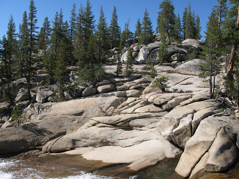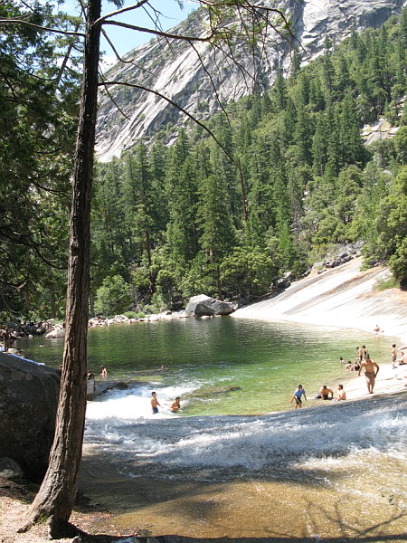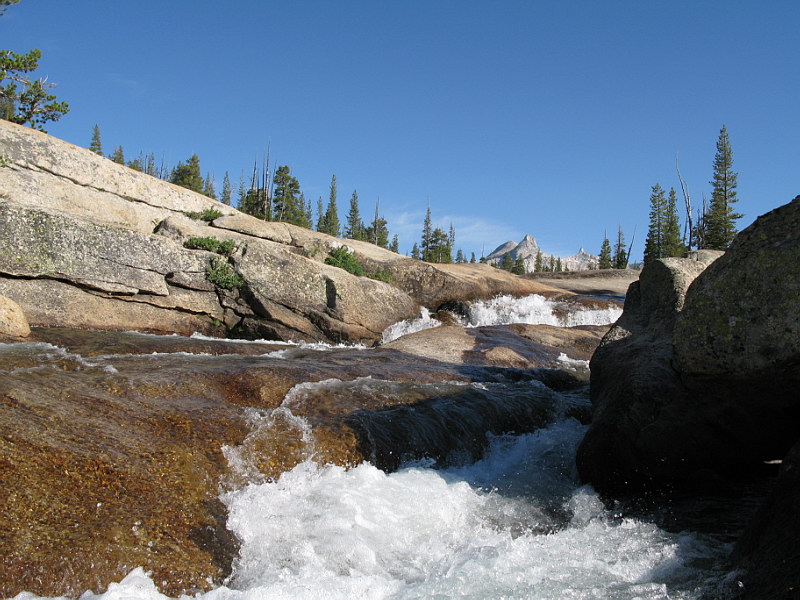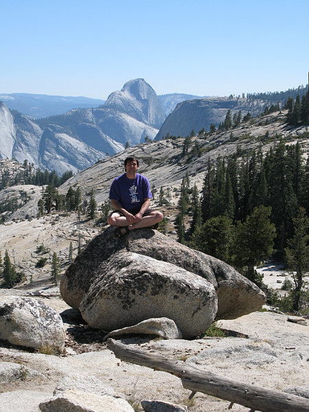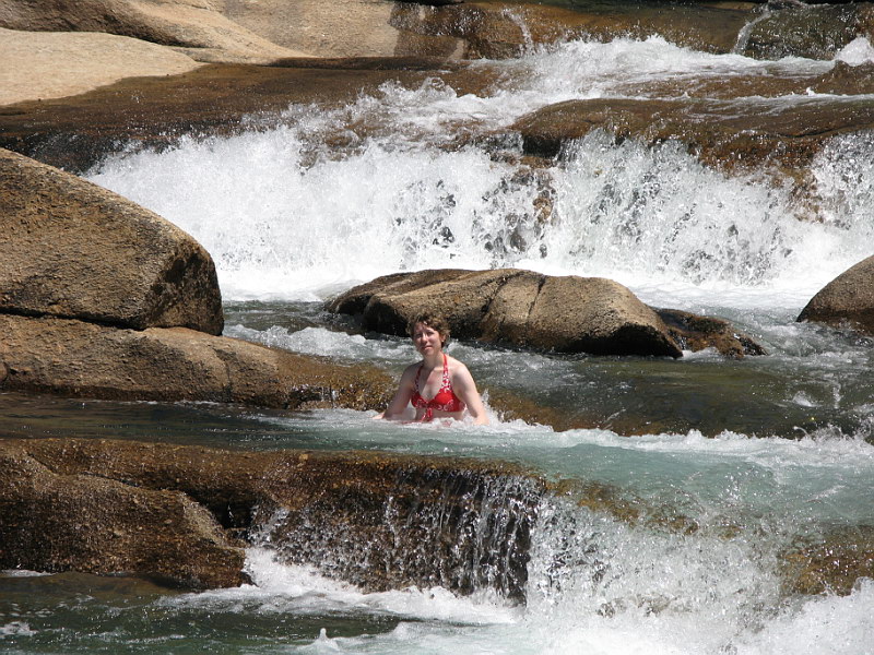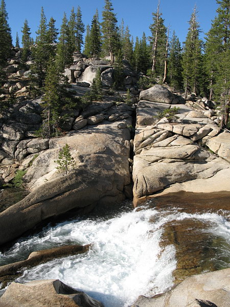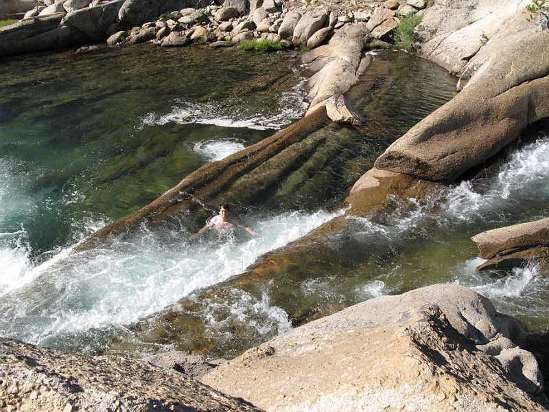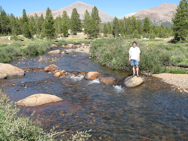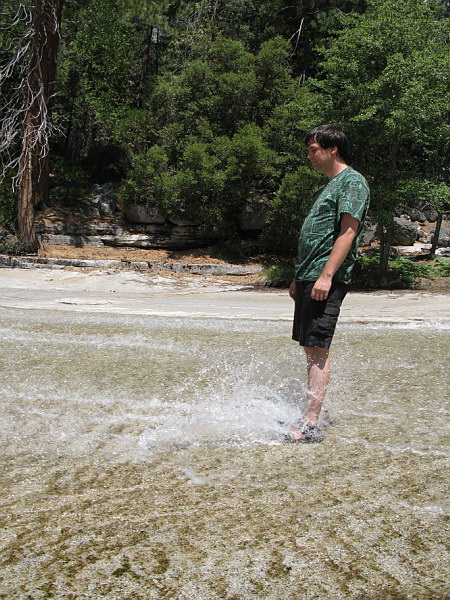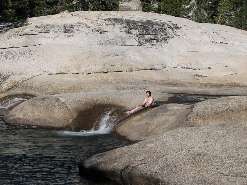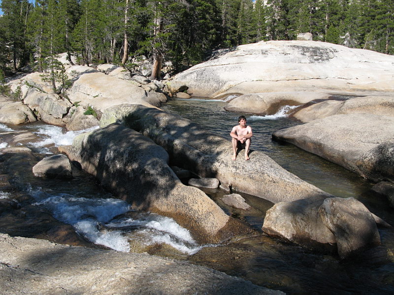 Our next stop was Yosemite, but as we got closer, we saw signs for a place called Mono Lake. Intrigued, we had to stop. It was worth it! It’s this intensely saline lake (twice the salt content of the ocean), crowned with interesting mineral formations called “tufas”. We walked around for a bit, enjoying the views of the water and the sea birds that nest there before we headed through Tioga Pass into Yosemite National Park. At the gate we handed over our receipts for Carlsbad Caverns, Mesa Verde, the Grand Canyon and Death Valley, plus $8.00 and voila! We were in Yosemite! OK, for the record: Yosemite is the awesomest of awesome parks. We stopped for pictures so many times before we even hit the first visitor center that it wasn’t funny (but it was worth it!). The color combinations of the clear blue sky, gleaming grey granite and delicate green vegetation alone was staggering. When we finally made it to the Tuolumne Visitor Center Rick asked if there was a trail in the area where one could see waterfalls. The ladies said “Yes!” and they directed us to a little-known trail called “Pothole Dome”. Sounded good to us. The trailhead was tricky to find but once we found it, the path was easy to follow. We wound our way through a delightful mountain meadow shielded with pine trees and stark granite spires rising up in every direction on the horizon. We walked for a little way along a slowly meandering stream where deer grazed unconcerned. After being briefly led through a lightly wooded area, we emerged back at the same river that was now playfully tripping down rushing cascades! Rick was in seventh heaven. He stripped down to his swim trunks and dove in, begging me to join him. Though I found the place beautiful and perhaps worthy of a good dip, it was getting late in the evening (it was pushing five or six o’clock by then) and I simply wasn’t eager to jump into freezing mountain water at that time of day. Rick was so insistent that I promised we could spend the whole of the next day there since I was interested in exploring further down the river and climbing on some the inviting escarpments that lined the river. We were ahead of schedule still, so this would not pose a problem at all. We decided to double back to the visitor area we had initially stopped at as there was camping there and the sites further down the road were MUCH further down the road. |