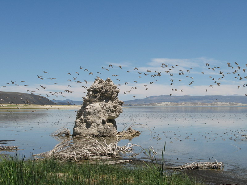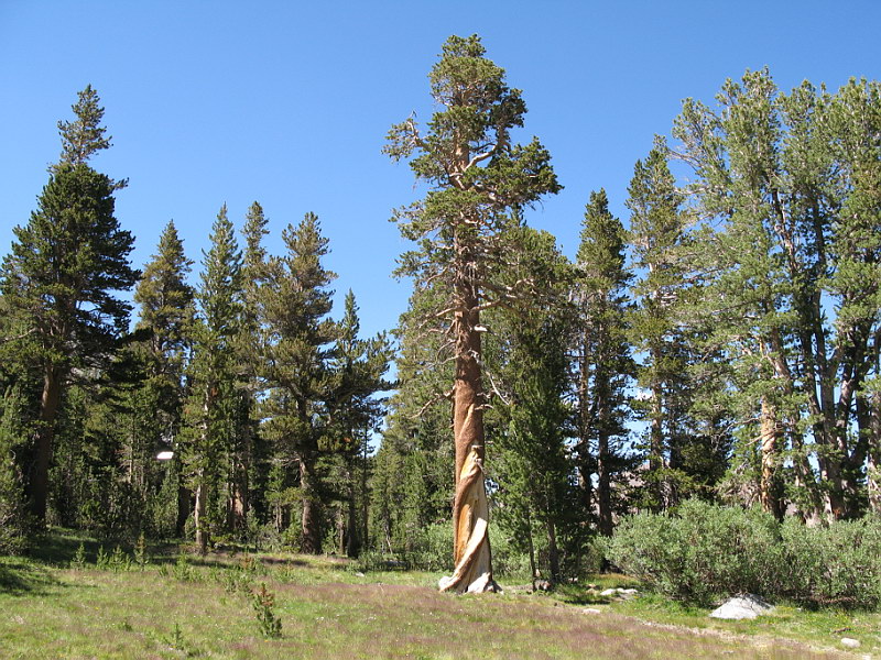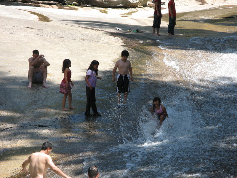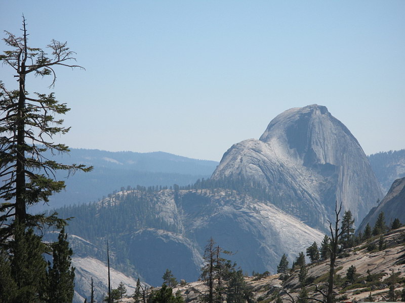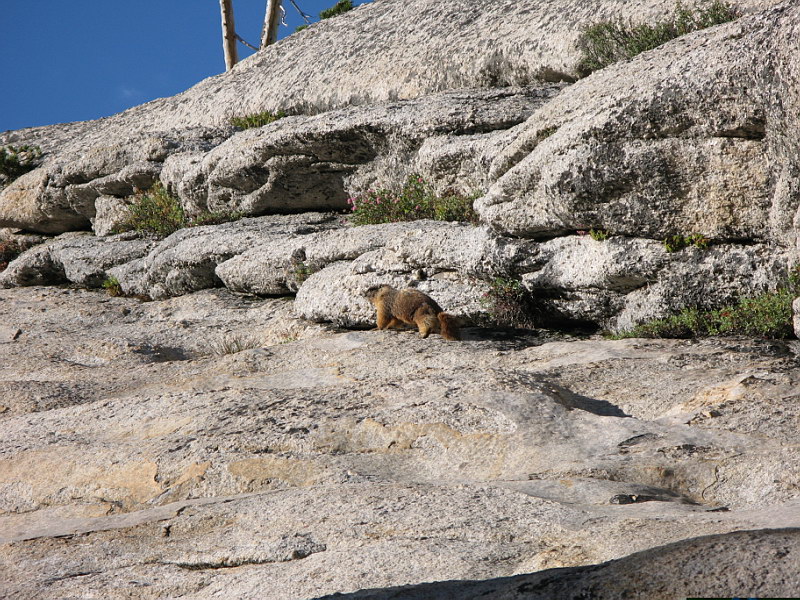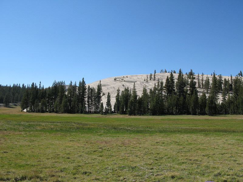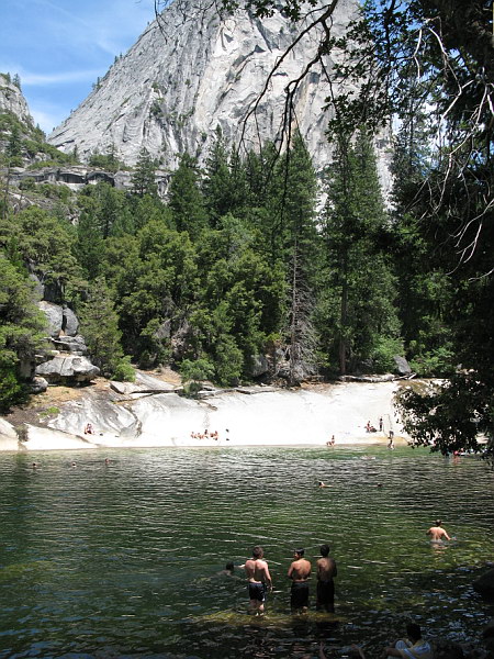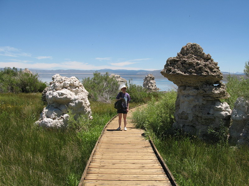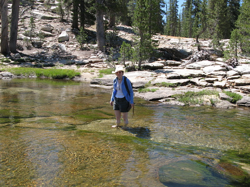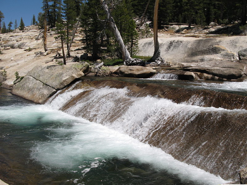 Our next stop was Yosemite, but as we got closer, we saw signs for a place called Mono Lake. Intrigued, we had to stop. It was worth it! It’s this intensely saline lake (twice the salt content of the ocean), crowned with interesting mineral formations called “tufas”. We walked around for a bit, enjoying the views of the water and the sea birds that nest there before we headed through Tioga Pass into Yosemite National Park. At the gate we handed over our receipts for Carlsbad Caverns, Mesa Verde, the Grand Canyon and Death Valley, plus $8.00 and voila! We were in Yosemite! OK, for the record: Yosemite is the awesomest of awesome parks. We stopped for pictures so many times before we even hit the first visitor center that it wasn’t funny (but it was worth it!). The color combinations of the clear blue sky, gleaming grey granite and delicate green vegetation alone was staggering. When we finally made it to the Tuolumne Visitor Center Rick asked if there was a trail in the area where one could see waterfalls. The ladies said “Yes!” and they directed us to a little-known trail called “Pothole Dome”. Sounded good to us. The trailhead was tricky to find but once we found it, the path was easy to follow. We wound our way through a delightful mountain meadow shielded with pine trees and stark granite spires rising up in every direction on the horizon. We walked for a little way along a slowly meandering stream where deer grazed unconcerned. After being briefly led through a lightly wooded area, we emerged back at the same river that was now playfully tripping down rushing cascades! Rick was in seventh heaven. He stripped down to his swim trunks and dove in, begging me to join him. Though I found the place beautiful and perhaps worthy of a good dip, it was getting late in the evening (it was pushing five or six o’clock by then) and I simply wasn’t eager to jump into freezing mountain water at that time of day. Rick was so insistent that I promised we could spend the whole of the next day there since I was interested in exploring further down the river and climbing on some the inviting escarpments that lined the river. We were ahead of schedule still, so this would not pose a problem at all. We decided to double back to the visitor area we had initially stopped at as there was camping there and the sites further down the road were MUCH further down the road. |