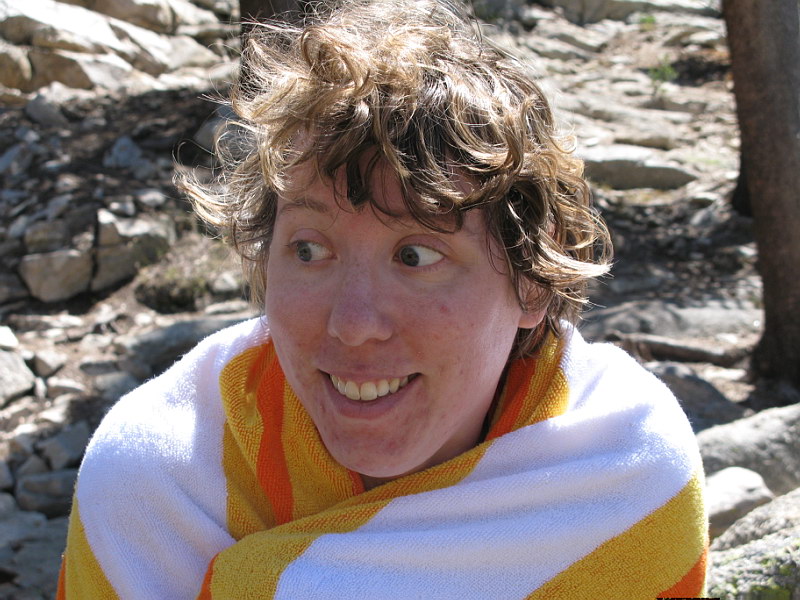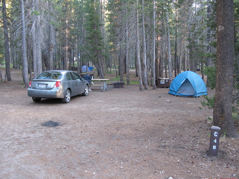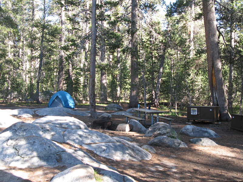 As promised, we returned to the enchanting river (this time I brought my swim suit). We climbed up and down the rocks and waded through the river at shallow spots – pictures being taken at every juncture. This was the northern part of Yosemite, not often visited by tourists, so there were few people about. In fact, we could hike for a half hour or so and maybe come across a person or two. It was just perfect! I did end up going for a swim, but the water really was cold (even after walking around all day!) and I didn’t stay in too long. Rick on the other hand was like an otter – slipping into a pool here, sliding down a natural slide there. He was in his element in the river; I was in my element scaling the sturdy granite around us. When we’d had our fill we wandered back to the car and drove down the road to the next camping area (called White Wolf). We picked out a camp site and signed up for dinner at the main cabin. We thought it’d be a fun experience. It was fun…and expensive. Three course dinner – wasn’t expecting that! It was a little opulent for us (the red checkered table cloths tried to mask the “hoity-toitiness” of it all, but it was still over the top in our opinions). |