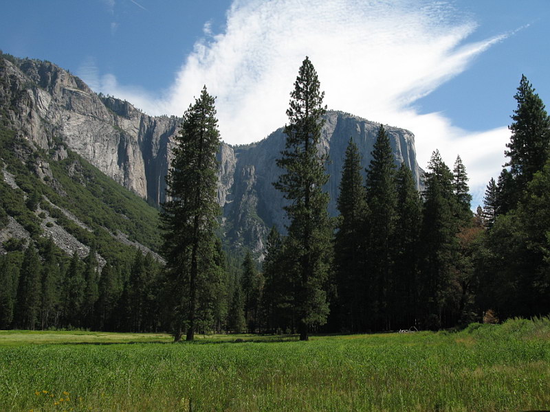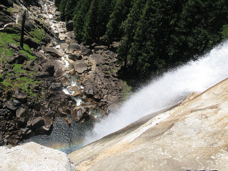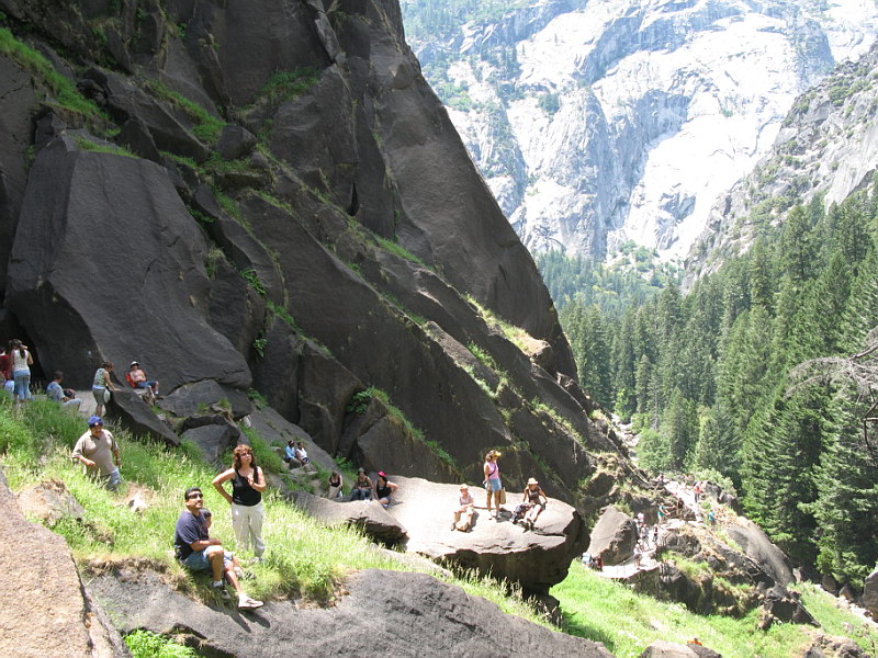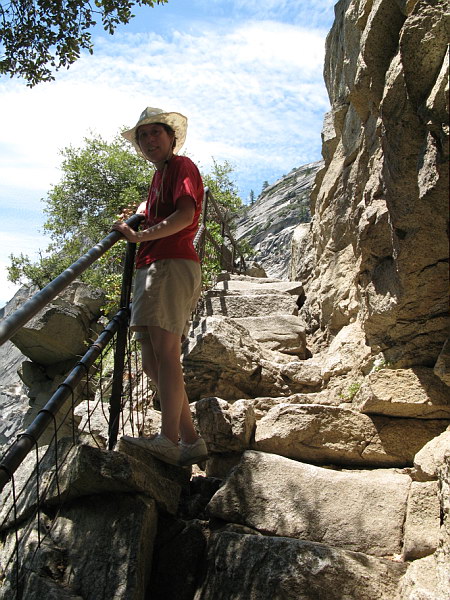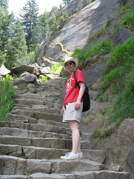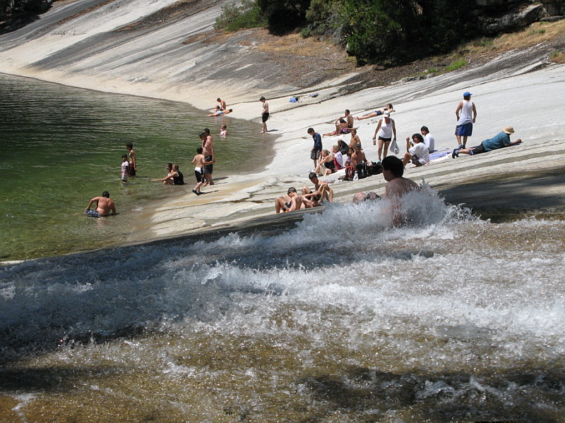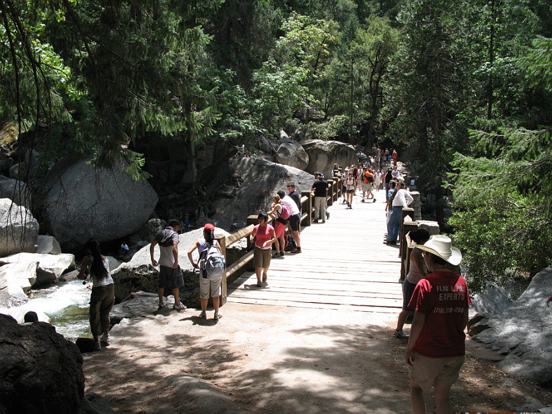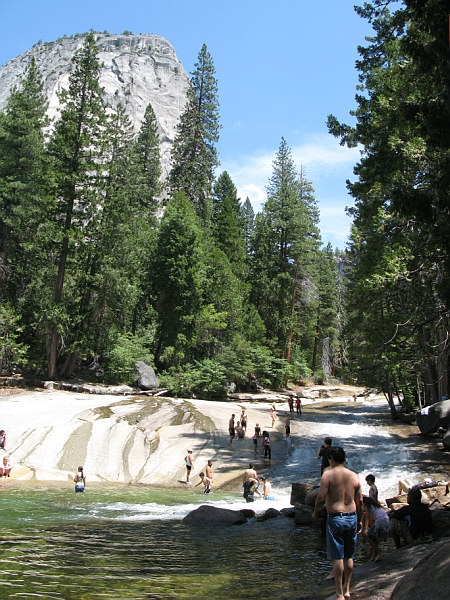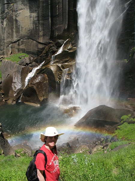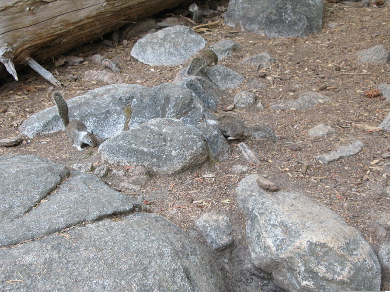 This was the day we did the “usual” touristy things in Yosemite. We saw El Capitan and Half Dome. Like the Grand Canyon, this area was packed with tourists – quite the shock from the tranquil day before! We decided we’d hike the Vernal Falls trail, it wasn’t THAT long of a hike (only a couple of miles). Well, those couple of miles were pretty much straight up. Oh it was brutal. Then we got to Vernal Falls and it was no longer torture without purpose; but getting to a good viewing point for these magnificent water fall wasn’t the half of it – you could go to the top of the falls! This meant another arduous climb; this time up steep, narrow stone steps. The top of the falls was unimpressive and rather anticlimactic but then we wandered upstream a little bit and discovered why so many people were willing to make such an insane hike. It was a little place called the Emerald Pool. The Emerald Pool is a soothing, calm pond that’s fed by water running down a washboard-smooth sheet of granite incline. Normally the area is closed to the public (there’s signs EVERYWHERE telling you not to go in the water), but the water levels were low this time of year and though the water shooting down the incline was intense (you couldn’t walk across it safely), it proved to be the perfect water slide and that’s just was all these people were doing – sliding down into the Pool. Granted, if you weren’t careful, you could easily get hurt and it is very obvious as to why the place is signed up and down, but people were careful and adults would often shunt children to safer areas as they went zooming down the rocks. Of course Rick took his turn. I was content to sit and rest; watching the people and the birds and squirrels drawn by the vast abundance of offered candies and nuts. (There’s signs saying not to feed the animals too). After we were both rejuvenated, we worked our way back down the trail (going down is MUCH easier and quicker!) Next we wandered over to the famed Yosemite Falls which weren’t as spectacular as anticipated being that the water levels really were rather low. Still, that was an easy walk and a nice ending activity for our time there. Back to the car and our next challenge – escaping Yosemite at 6:00pm on a Saturday – no easy feat! We did make it out alive without killing anyone. I wanted a hot shower. Though I loved Yosemite to not end, I was done camping for now. This proved harder than we had thought possible. Our first stop was Sonora. Just so happened the town was hosting the Annual Junior Livestock Auction – which equates to a large county fair. All the hotels in the county (county!) were full. We were however, given directions to the cheapest gas station in town – our second highest priority. With a comfortably full gas tank, we looked to comfortably fill our bellies and so we stopped at a Round Table Pizzeria. Food perked us up and we continued our quest for a room. We weren’t picky – it just needed to be clean and have a working shower with hot water. We FINALLY found a place (well past dark) in a little town where you booked the room at the adjoining gas station. That was interesting; but the room suited our needs nicely and we could finally get clean and get some sleep! |