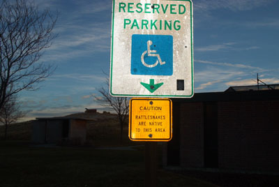 Handicap parking and rattle snake sign at welcome center in Nebraska